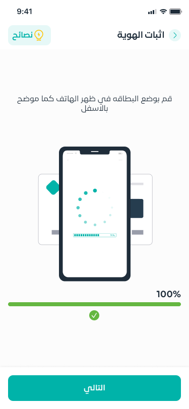 Identity verification inside the app: Users capture photos of their national ID, then take a liveness selfie with simple tips on lighting, framing, and camera setup. The app shows progress as their data is read and reviewed.